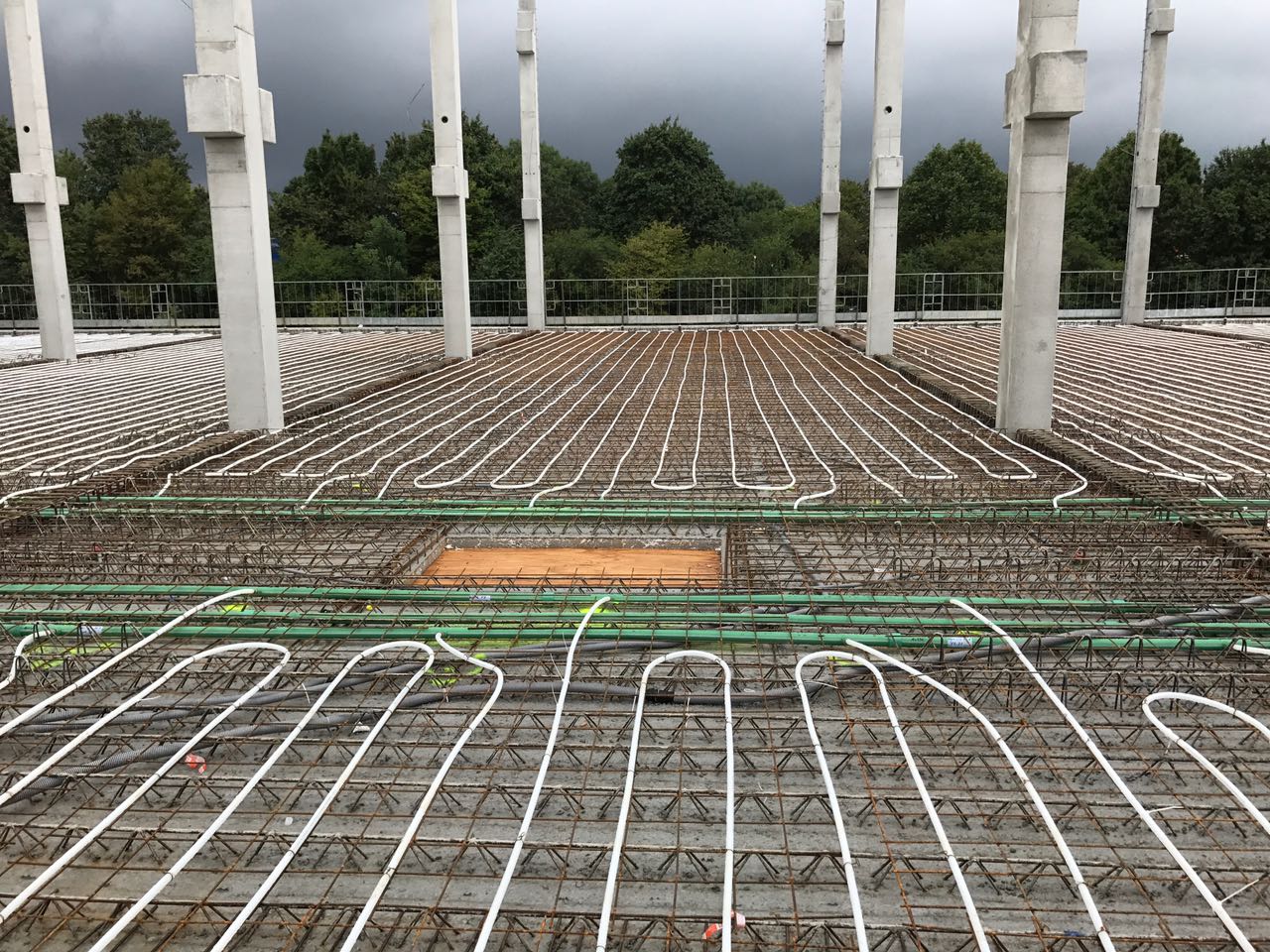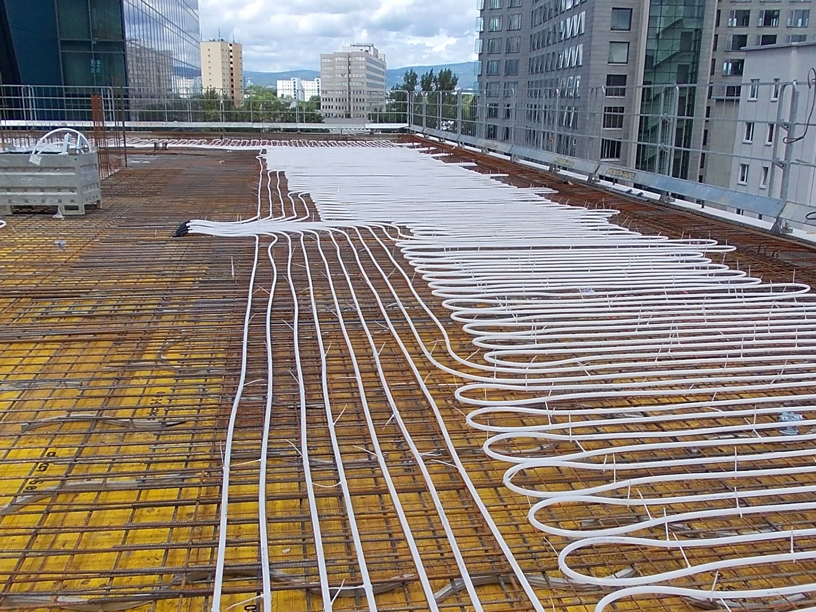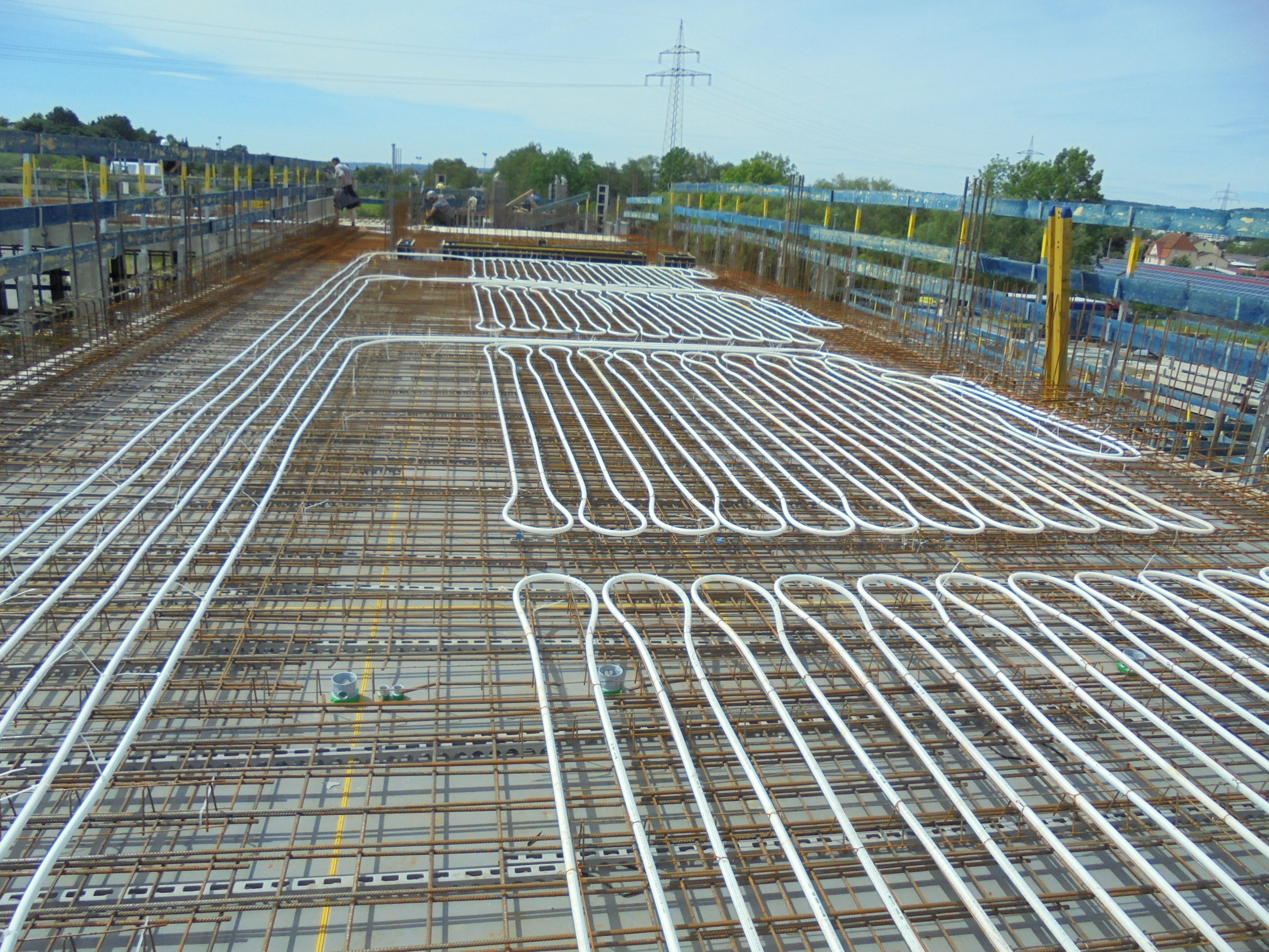 Die erreichbaren Leistungen dieser Flächenheizung erhöhen sich, je näher die Kunststoffrohre an der Oberfläche der betonierten Fläche positioniert sind.